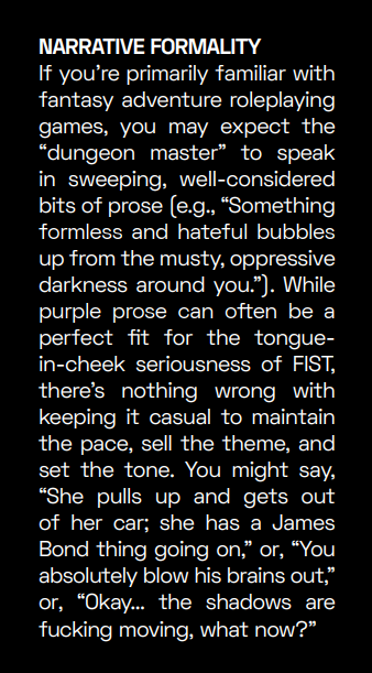 In this note from FIST: Ultra Edition, designer B. Everett Dutton speaks to what players coming from fantasy games with a “dungeon master” might expect in-game narration to sound like, then suggests a different approach that might better fit the genre and theme of FIST.